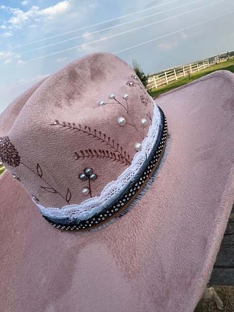 Beautiful Rachel design with pearl and rhinestone embellishments features 4 bands of denim, lace, rhinestones and leather